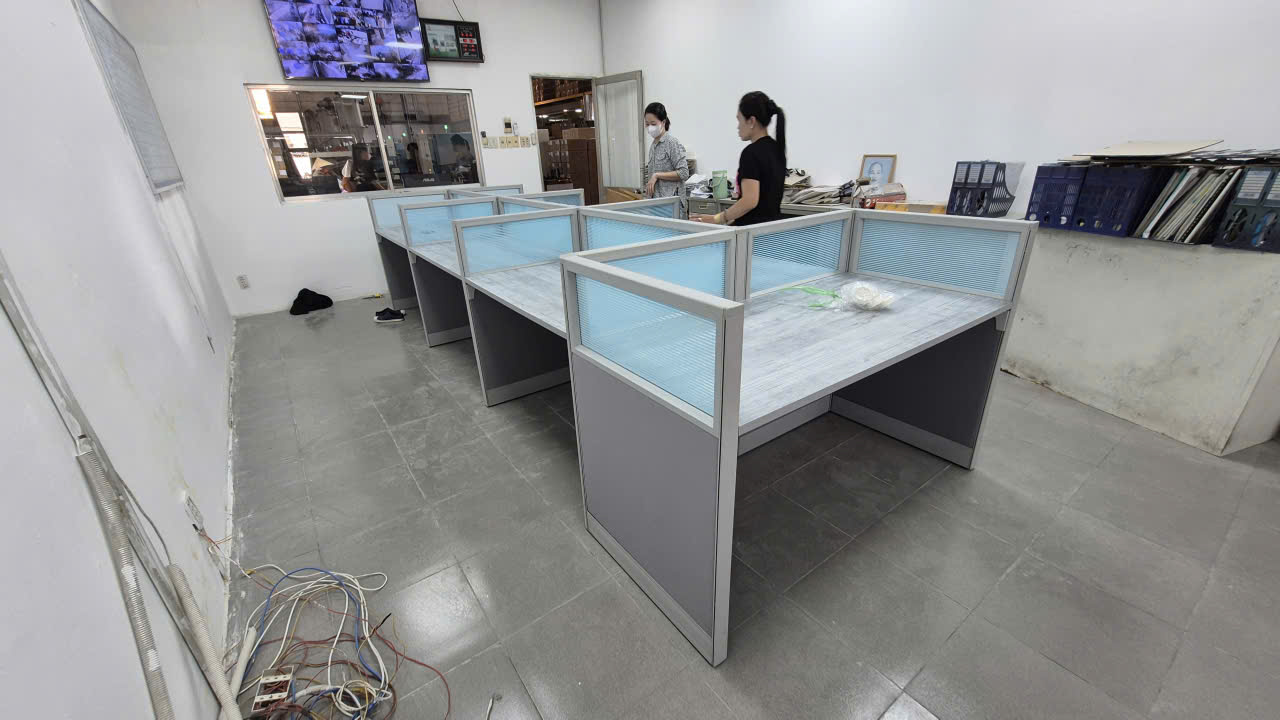 Cụm bàn này không chỉ là những chiếc bàn ghép lại. Nó là một hệ thống thống nhất với sự kết hợp bàn làm việc và vách ngăn văn phòng được thiết kế yêu cầu: